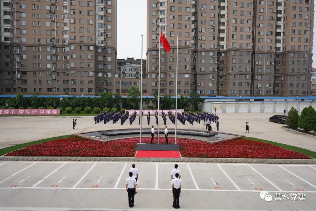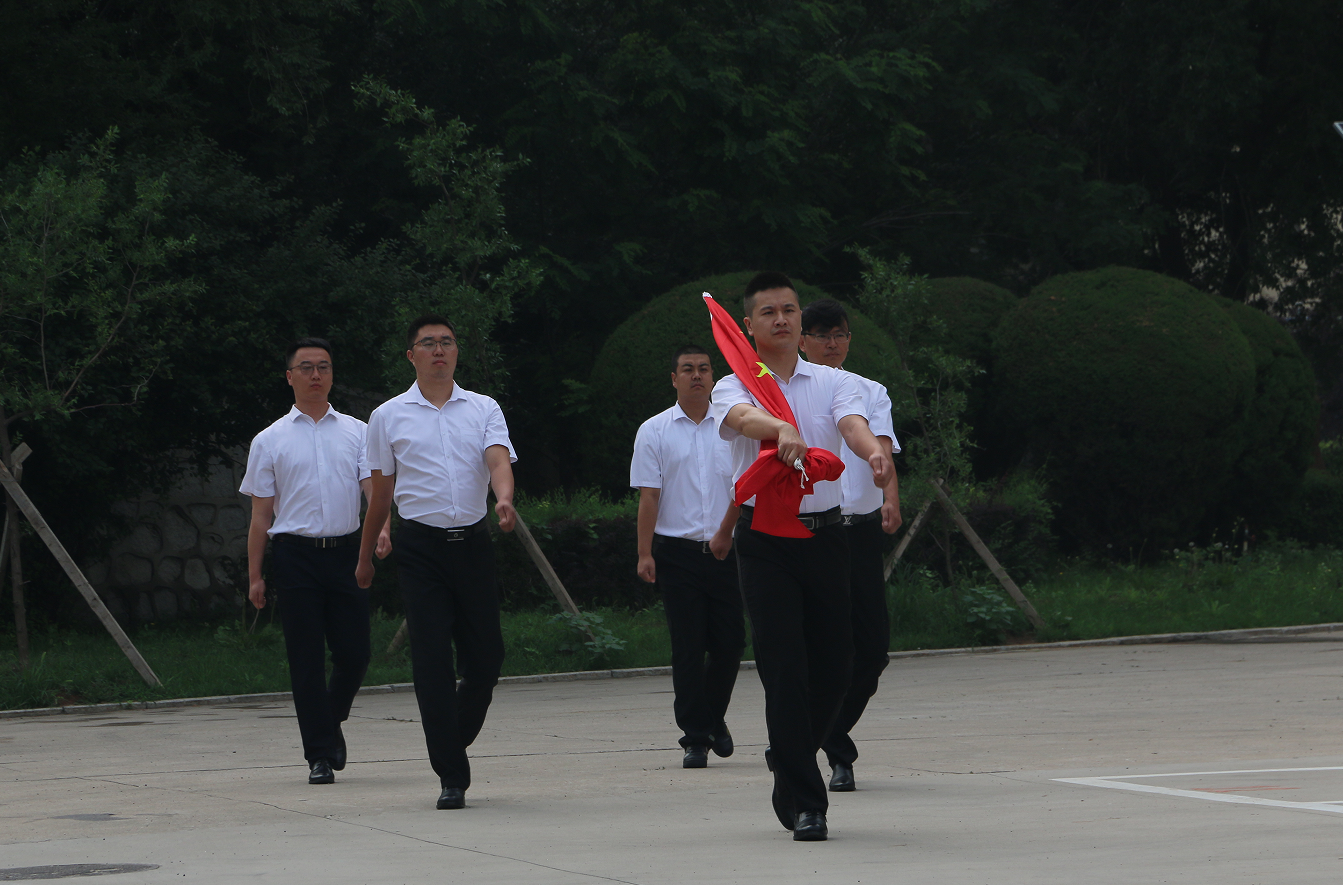 全體黨員整齊著裝,在辦公樓前列隊,英姿颯爽的護旗手邁著鏗鏘有力的步伐,托舉五星紅旗走向升旗臺。